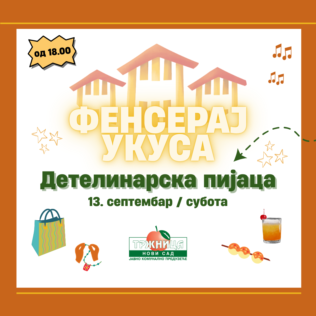Fenseraj ukusa na Detelinarskoj pijaci - mesto susreta, dobre energije i provoda! U subotu, 13. septembra, od 18 sati dođite da zajedno uživamo u šarenilu ukusa i mirisa. Domaći proizvodi, rukotvorine i unikatni pokloni, raznovrsna hrana i piće, odlična atmosfera, jer pijaca je pravo mesto za druženje i nezaboravne trenutke!